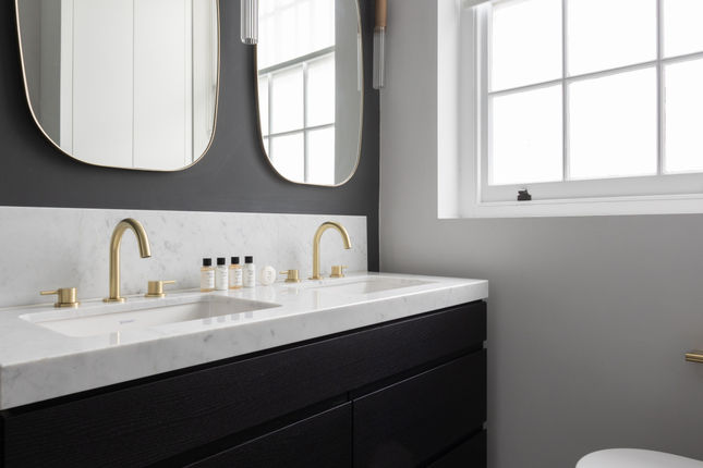 There’s a super king-sized bed in the master bedroom with a large television, great for indulging in an unhurried morning before heading out into the city. The elegant second bedroom has a double bed. Both rooms share the bathroom, a sleek space with opulent marble features and gold accents.